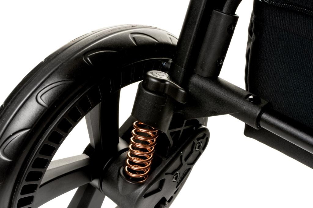 Regulowana twardość zawieszenia to pionierskie rozwiązanie w wózka spacerowych, dzięki temu udogodnieniu możemy dostosować amortyzację do terenu, na którym będziemy spacerować.