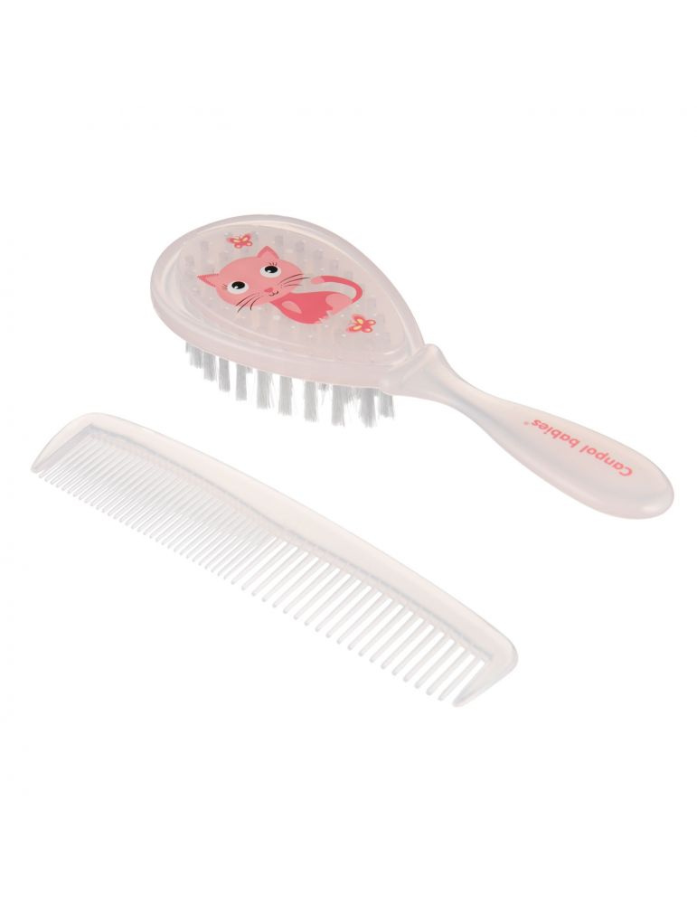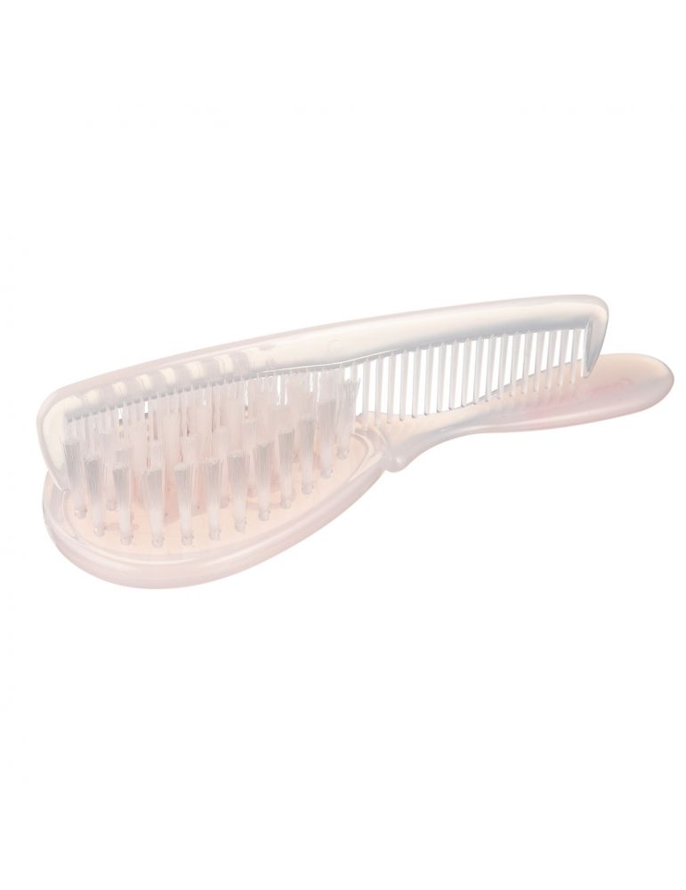 Szczotka do włosów z grzebykiem do codziennej pielęgnacji włosów dziecka. Grzebień posiada zaokrąglone ząbki, które nie podrażniają wrażliwej skóry malucha. Szczotka z twardym, sztucznym włosiem delikatnie masuje główkę dziecka, nie elektryzując włosów. Zestaw dostępny w kilku wariantach kolorystycznych.