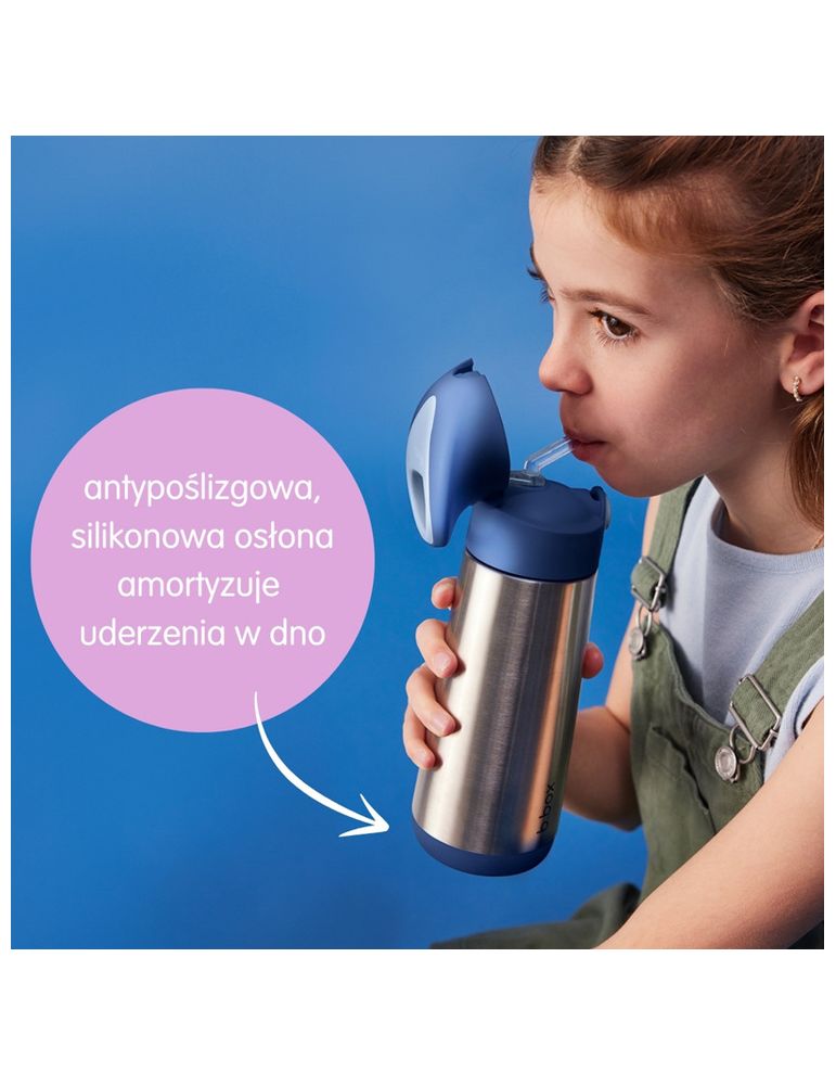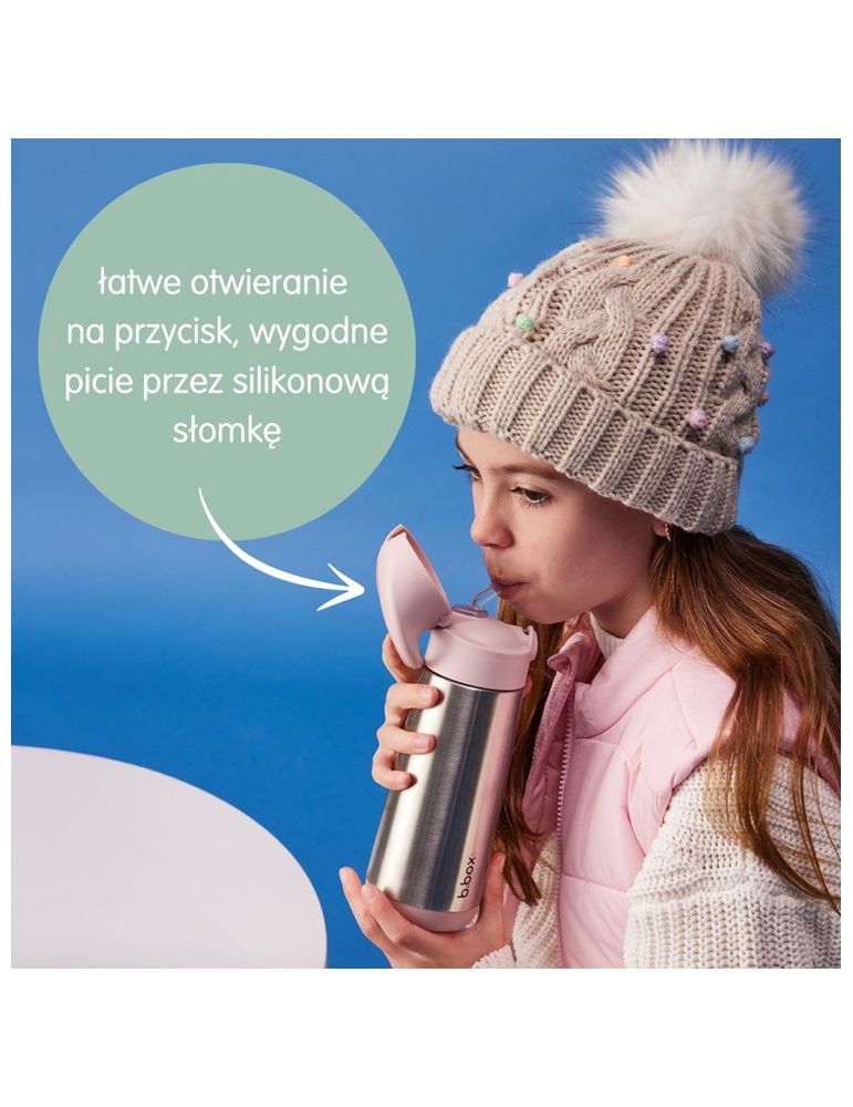 Innowacyjna termobutelka ze słomką marki b.box. Dzięki podwójnym ściankom ze stali nierdzewnej utrzymuje temperaturę do 8 godzin.