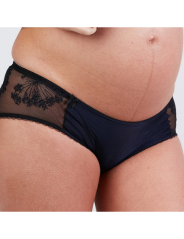 Szorty Louise z niskim stanem zapewniają maksymalny komfort noszenia podczas ciąży i po porodzie. Prześwitująca siateczka z delikatnym haftem w strefie pośladków oraz satynowa kokardka nadają bieliźnie kobiecości i romantyczności.