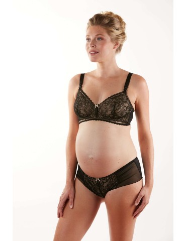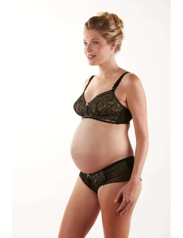 Biustonosz ciążowy i do karmienia piersią bez fiszbin. Wykonany z bardzo miękkiej mikrofibry i tiuli. Wyrafinowana i rozciągliwa koronka z motywami roślinnymi. Urocza satynowa kokardka. Magnetyczne zapięcia ułatwiają szybkie otwarcie za pomocą jednej ręki.