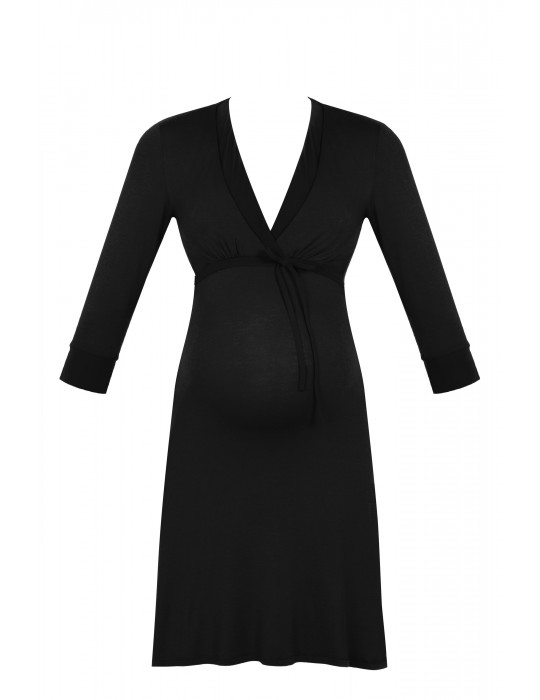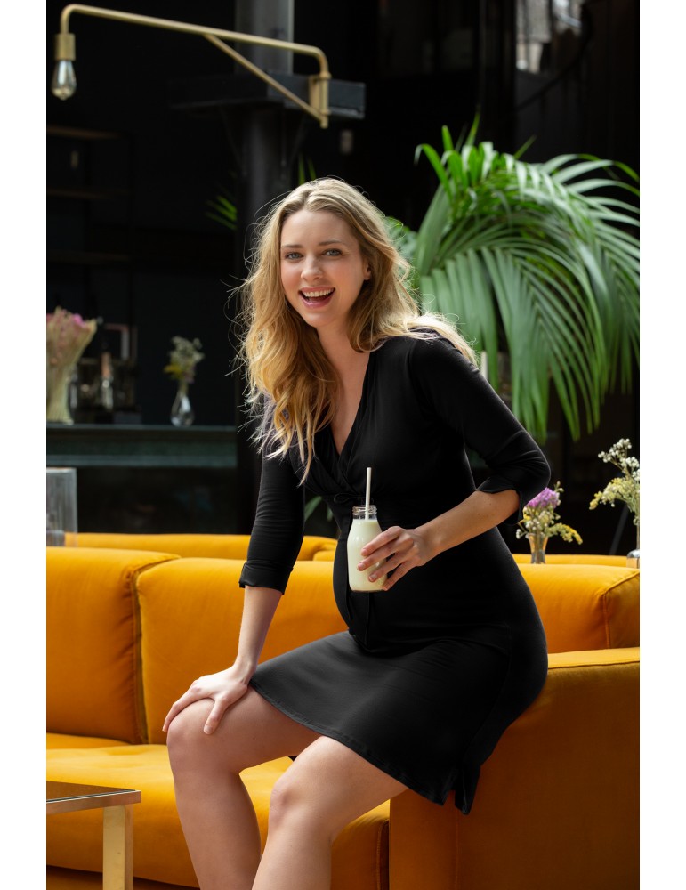 Ponadczasowy fason z rękawami 3/4 i głębokim dekoltem podkreślą kobiece ciało. Wiązanie pod biustem podczas ciąży pozwala na regulowanie szerokości koszuli i dopasowanie do zmieniających się kobiecych kształtów. Natomiast po porodzie ułatwia dostęp do piersi, zapewniając łatwe i wygodne karmienie pociechy.