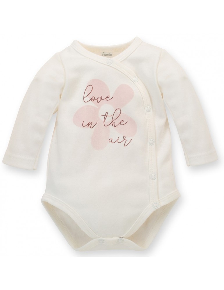 Dziewczęce body z długim rękawem z przyjemnej w dotyku bawełny w kolorze ecru. Z przodu umieściliśmy piękny, jasnoróżowy kwiat w stylu retro i napis LOVE IN THE AIR. Nadruk wykonany został trwałą metodą farb wodnych. Body można rozpinać na całej długości, za pomocą wygodnych zatrzasków, co znacząco ułatwia ubieranie i przewijanie maluszka. Dla bezpieczeństwa, zapięcia wykonano z antyalergicznego tworzywa bez dodatku niklu. Nasze rozpinane body to niezbędny element wyprawki każdego noworodka. Możesz je dowolnie łączyć z innymi ubrankami z kolekcji Happiness, tworząc wiele modnych stylizacji. Body, podobnie jak inne ubranka Pinokio, posiada certyfikat BEZPIECZNY DLA DZIECKA.