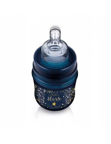 Butelka do podawania odciągniętego mleka mamy. Ciemna kolorystyka butelki, wyróżnia się na rynku, a jednocześnie umożliwia kontrolowanie ilości mleka. Zdobiona w złote drobinki, podkreślające unikalność kolekcji Stardust.