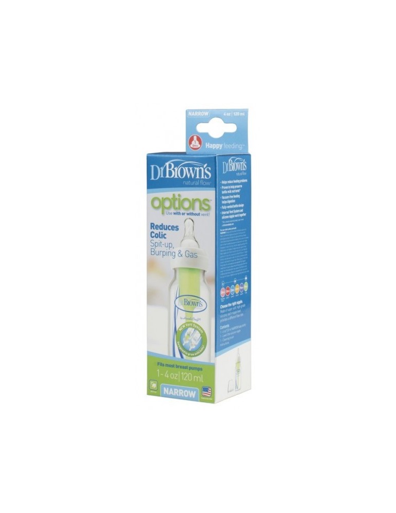 Najnowsza standardowa (wąska szyjka) butelka firmy Dr. Brown`s o pojemności 120ml i symbolu SB41005. To co odróżnia ją od poprzedniej wersji to nowa konstrukcja pozwalająca wymontować wewnętrzny system odpowietrzający w momencie w którym dziecku nie grożą już kolki. Nowa linia butelek Dr. Brown`s nosi nazwę "Options". Butelka o pojemności 120ml jest produktem który doskonale sprawdzi się w początkowym okresie karmienia maluszka kiedy jego zapotrzebowanie na mleko jest niewielkie.