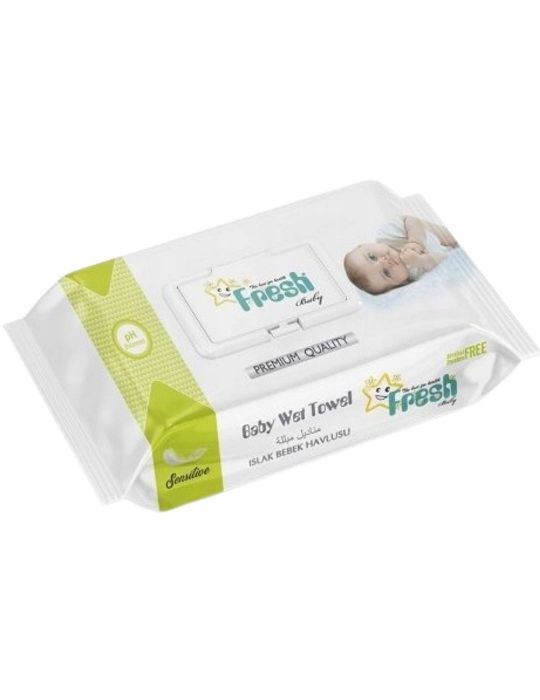Chusteczki nawilżane FRESH BABY sztuki z klipsem, mokre, do stosowania dla niemowląt, dzieci, dorosłych, PRO-VITAMINE B5, VITAMINA E, wykonane z delikatnego materiału, bardzo miły i przyjemny, zapach, produkt ważny 2 lata, każda chusteczka idealnie wilgotna, bez parabenów, nie zawierają alkoholu, duży klips co powoduje łatwość wyjmowania chusteczek.
