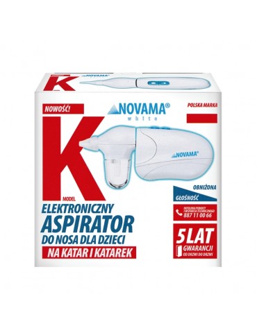 Aspirator Novama White K z łatwą obsługą. 2 stopnie mocy które kryją się pod dwoma przyciskami. Oczyszczanie nosa jest łatwe i szybkie. Odessana wydzielina może nie od razu pojawić się we wnętrzu zbiorniczka. Po każdym użyciu zaleca się szybkie oczyszczenie końcówki, wraz z głowicą i zbiorniczkiem po ich uprzednim demontażu z urządzenia. Dla bardziej efektywnego odsysania, zatkaj drugie nozdrze dziecka. Niewielka ilość soli fizjologicznej lub wody morskiej w aerozolu może pomóc rozrzedzić wydzielinę. Po aplikacji należy odczekać chwilę, a następnie przystąpić do odsysania wydzieliny. Aby zmniejszyć dyskomfort spowodowany podciśnieniem, należy otworzyć usta dziecka. Zużyte lub częściowo zużyte baterie mogą mieć wpływ na efektywność pracy urządzenia i co za tym idzie oczyszczania. Obniżona głośność i maksymalna dostępna moc Novama White K. Końcówki, zbiorniczek na wydzielinę oraz głowicę urządzenia można demontować i myć pod bieżącą wodą (części te można dodatkowo dezynfekować wrzącą wodą). Dwie końcówki Novama White K na katar i katarek. Duża końcówka- zalecana starszym dzieciom i gdy wydzielina jest gęsta. Mała końcówka- zalecana młodszym dzieciom i w przypadku, gdy wydzielina jest rozwodniona i ciekła.