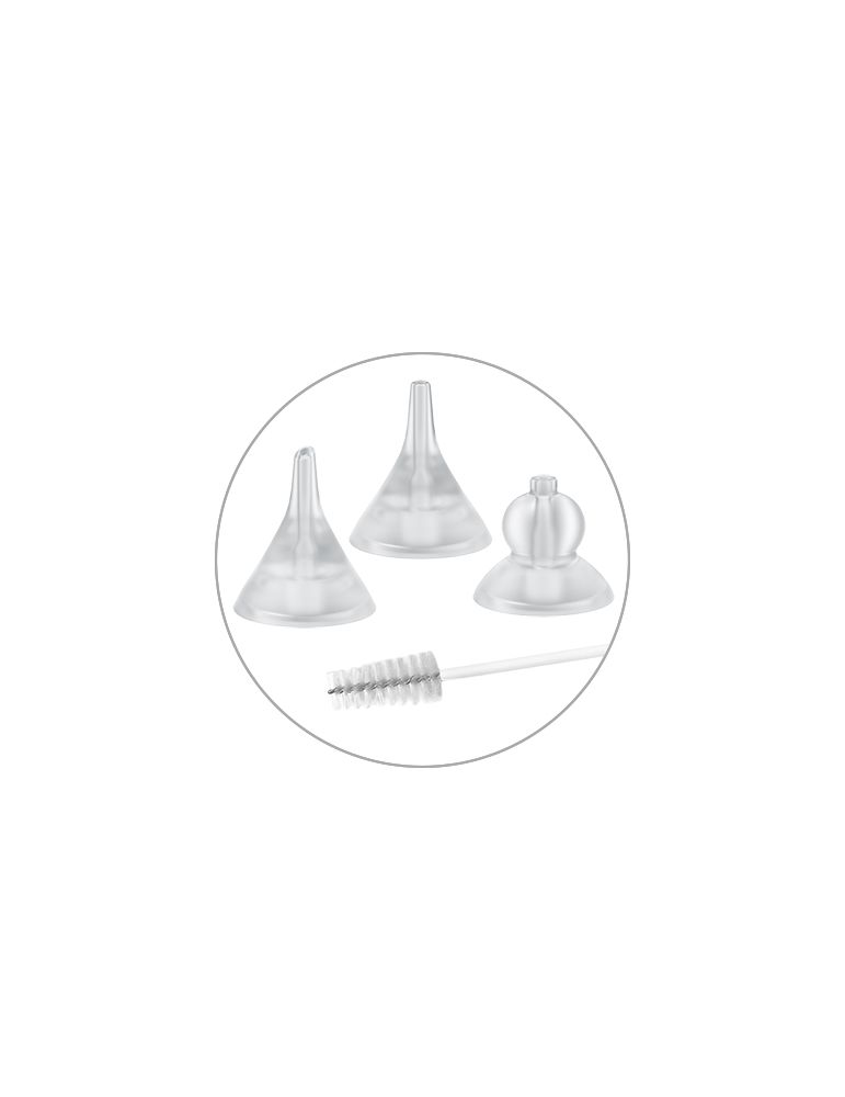 Ultramiękkie 3 silikonowe nasadki, które można dostosować do rodzaju wydzieliny i wieku niemowlaka. W zestawie dodatkowa szczoteczka czyszcząca. Gwarancja higieny i dopasowania do potrzeb najmłodszych.
