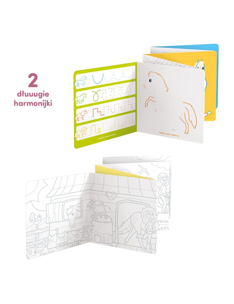 Zestaw zawiera 2 długie książeczki harmonijki pełne kreatywnych zabaw. To prawdziwa gratka dla wszystkich, którzy lubią konie i życie w siodle! Z jednej strony każdej książeczki znajduje się długa kolorowanka, a z drugiej twórcze zadania, dostosowanych do wieku przedszkolaków. Kolorowanki i łamigłówki inspirują do wesołych i rozwijających zabaw.