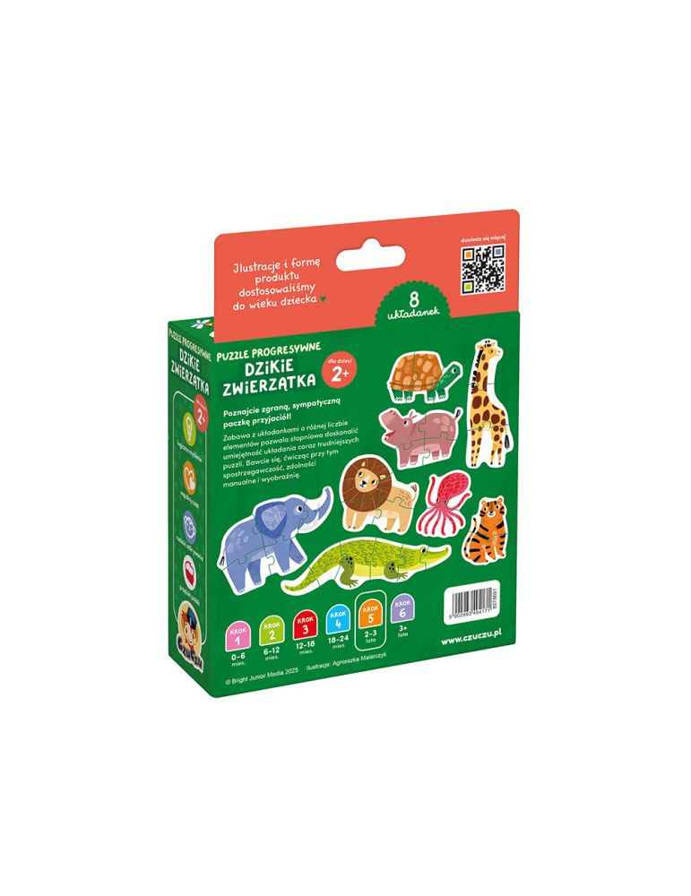 Puzzle progresywne Dzikie zwierzątka pozwalają na opanowywanie umiejętności układania coraz trudniejszych układanek krok po kroku. W zestawie znajdziecie 8 zwierzątek o różnym stopniu trudności: od 2 do 6 puzzli.