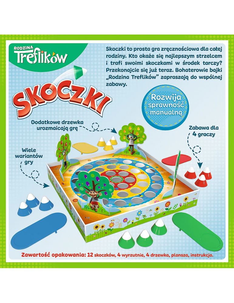 Skoczki na licencji serialu "Rodzina Treflików" to prosta gra zręcznościowa dla całej rodziny. Kto okaże się najlepszym strzelcem i trafi swoimi skoczkami w środek specjalnej tarczy? Przekonajcie się już teraz! Bohaterowie znanej bajki "Rodzina Treflików" zapraszają do wspólnej zabawy.