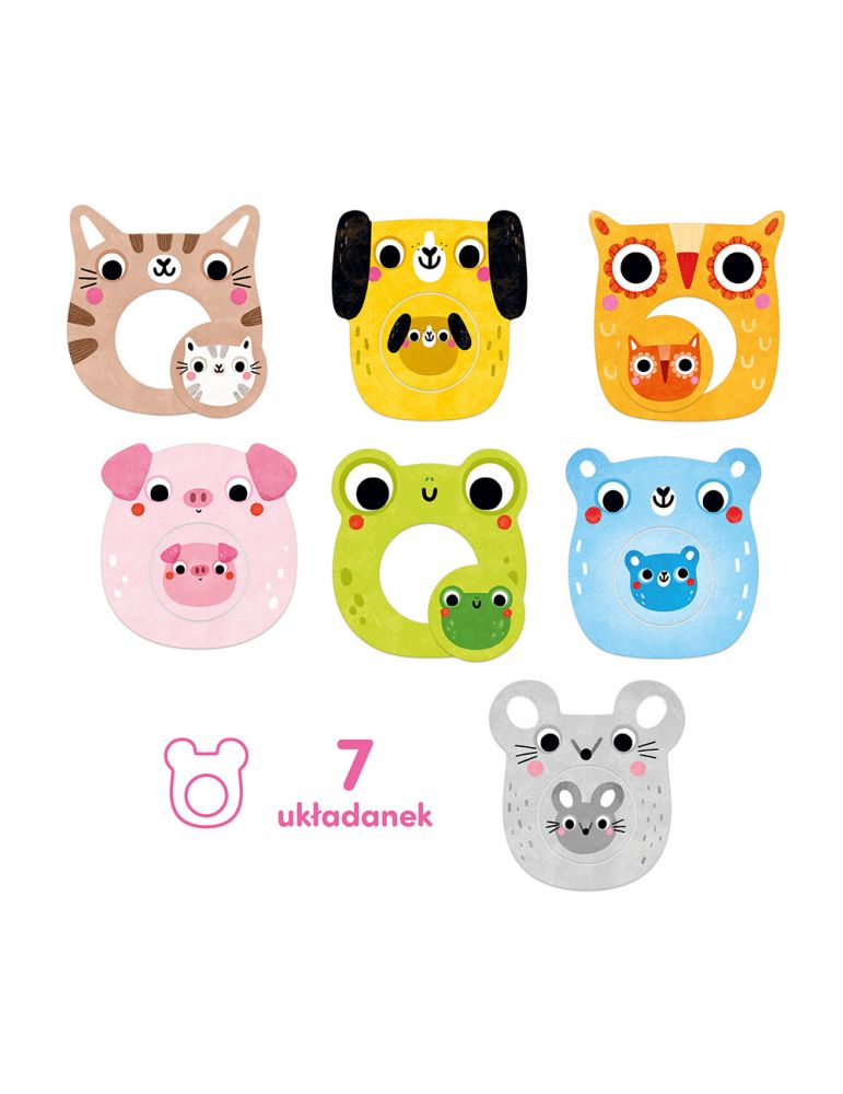 - Nazywaj zwierzątka, ich kolory i kształty. Zwróć uwagę dziecka na różnice i podobieństwa pomiędzy bohaterami układanek. Kto jest duży a kto mały?