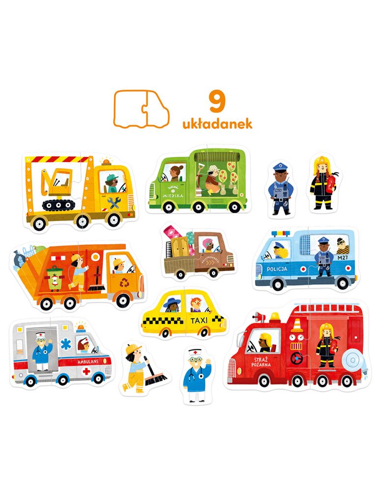 To doskonały zestaw edukacyjny dla dzieci, które dopiero rozpoczynają przygodę z układaniem. 8 kolorowych pojazdów (są tu między innymi wóz strażacki, śmieciarka, karetka czy taksówka) i 4 ludziki to świetna zachęta do tego, by ruszyć do zabawy, poznawać nowe słowa, wymyślać przeróżne aktywności. Każde połączenie elementów to powód do radości!