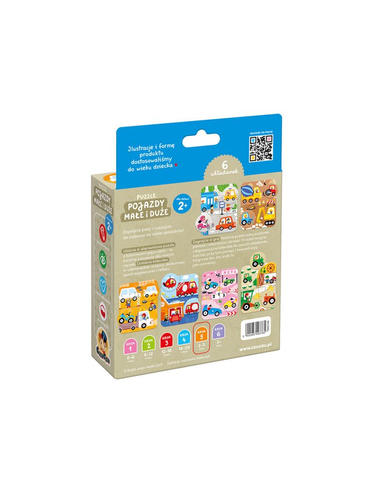 Hej, dzieciaki! Jesteście gotowi na kolejny krok puzzlowej przygody? Poznajcie Puzzle Pojazdy małe i duże. W zestawie znajdziecie 6 czteroelementowych puzzli i 12 żetonów – po 2 do każdej układanki. Kolorowe ilustracje przedstawiają przeróżne scenki z pojazdami, które dzieci znają i lubią. Znajdziecie tu wozy strażackie, wyścigówki, traktory czy pomoc drogową, które zainspirują do mnóstwa wszechstronnie rozwijających zabaw!