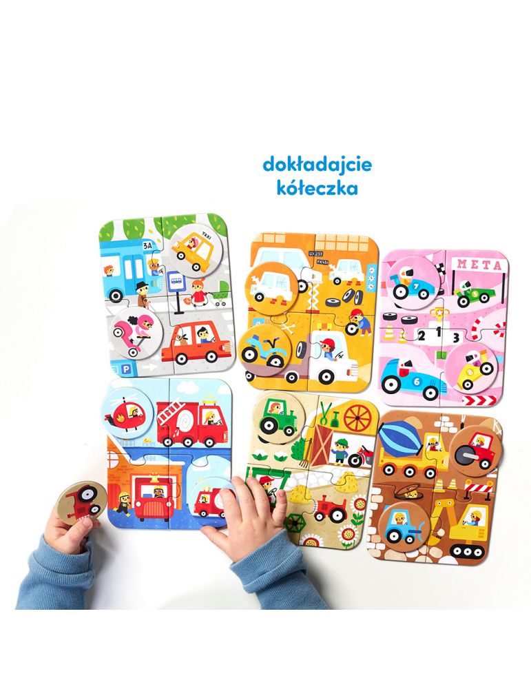 W zestawie znajdziecie 6 czteroelementowych układanek, które przedstawiają przeróżne auta, i 12 dokładanych żetonów z pojazdami. To świetny pomysł na pierwsze trudniejsze puzzle oraz grę – ułożone scenki stanowią plansze, do których można dopasowywać pasujące elementy. Możecie to robić albo na czas, albo odwracając je do góry nogami i grając niczym w planszowe memory. Zabawa start!