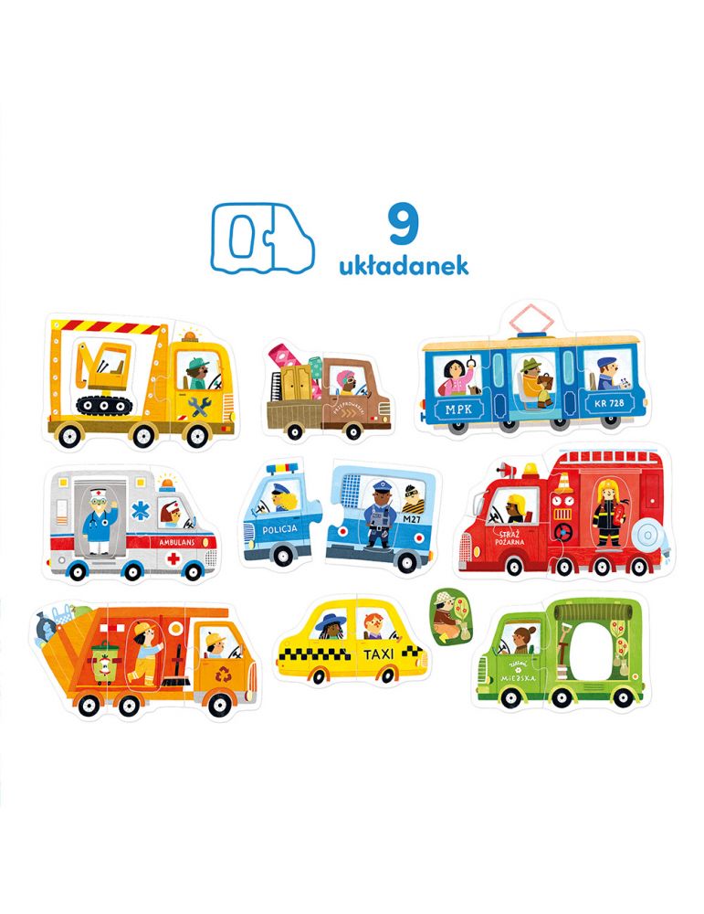 Układanki o rosnącej liczbie elementów (od 2 do 4) zapraszają najmłodszych układaczy do kolejnego etapu puzzlowej przygody. Kto poprowadzi karetkę, a kto wóz zieleni miejskiej? Wskakujcie do śmieciarki albo policyjnej furgonetki. Można też ruszyć tramwajem. Poznajcie kolorowe pojazdy i ruszajcie do akcji!