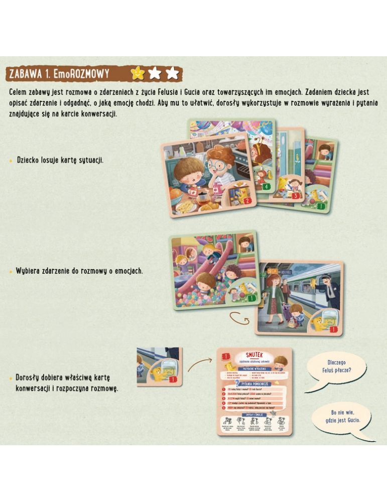 3 podstawowe rodzaje zabaw w tym zestawie to: memo, kalambury i konwersacje. Ten rodzaj aktywności szczególnie sprzyja nauce rozpoznawania, nazywania i wyrażania emocji, będącej głównym celem gry.