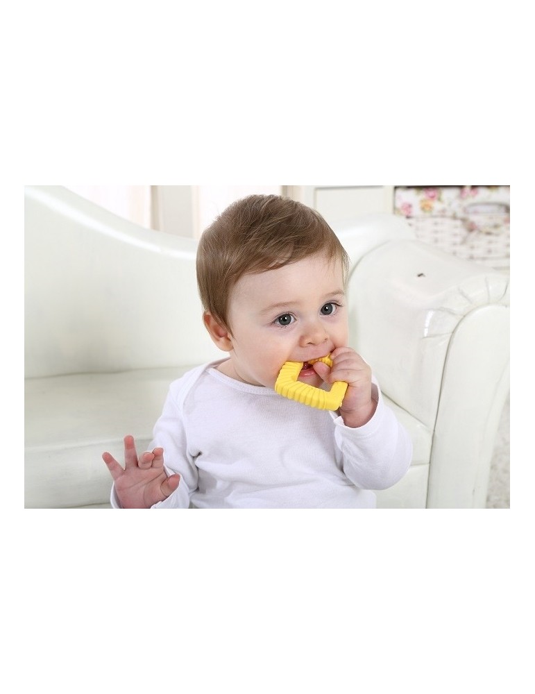 Silikonowy gryzak dla dzieci o geometrycznym kształcieprzypominającym przyjaznego lwa, to idealny pierwszy gryzak dla niemowlaka. Gryzak silikonowy odznacza się wyraźnym żółtym kolorem, który przyciągnie wzrok dziecka, zachęcając do gryzienia i zabawy. To podstawowy kolor który dziecko potrafi rozróżnić (z wyjątkiem czarno-białych). Ponadto gryzak dla niemowlaka jest przyjemny w dotyku. Falowana grzywa Lwa stymuluje u dziecka zmysł dotyku. Ponadto, gryzak dla dzieci delikatnie masuje dziąsełka i łagodzi ból podczas ząbkowania. Wyprofilowany kształt gryzaka i odpowiedni rozmiar umożliwiają dziecku swobodne chwytanie. Dodatkowo maluch już we wczesnym wieku może nauczyć się podstawowego kształtu geometrycznego jakim jest kwadrat. Silikonowy gryzak dla dzieci jest bezpieczny i łatwy w gryzieniu nawet po ochłodzeniu. Można używać go w zmywarce, mikrofalówce, a także przechowywać w zamrażarce.
