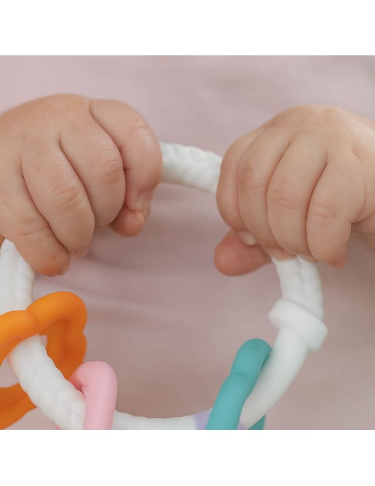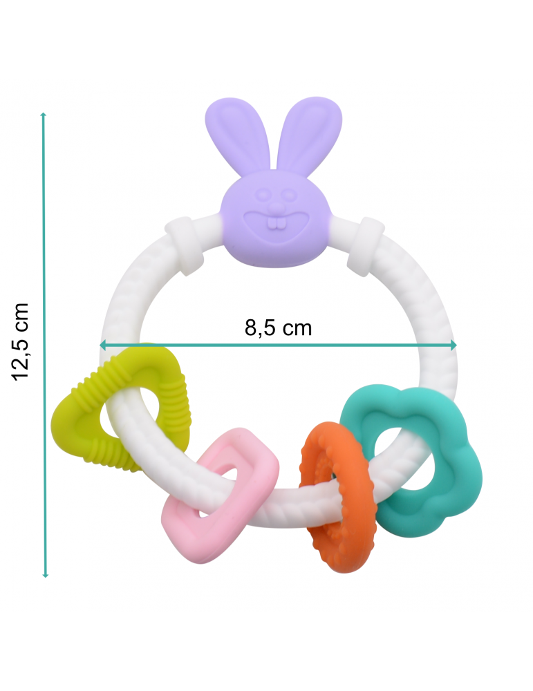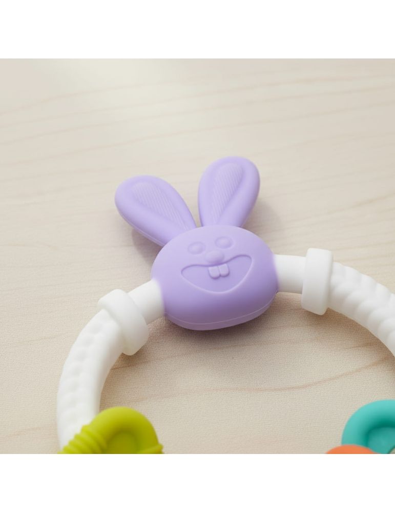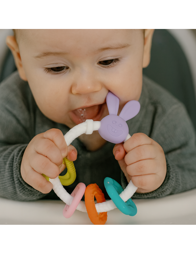 Centrum gryzaka stanowi fioletowa główka króliczka z długimi uszami, które idealnie nadają się do masowania dziąseł w tylnej części buzi. Biała, elastyczna obręcz posiada unikalną fakturę skręconego sznura, co zapewnia dodatkową stymulację sensoryczną przy każdym dotyku i gryzieniu.