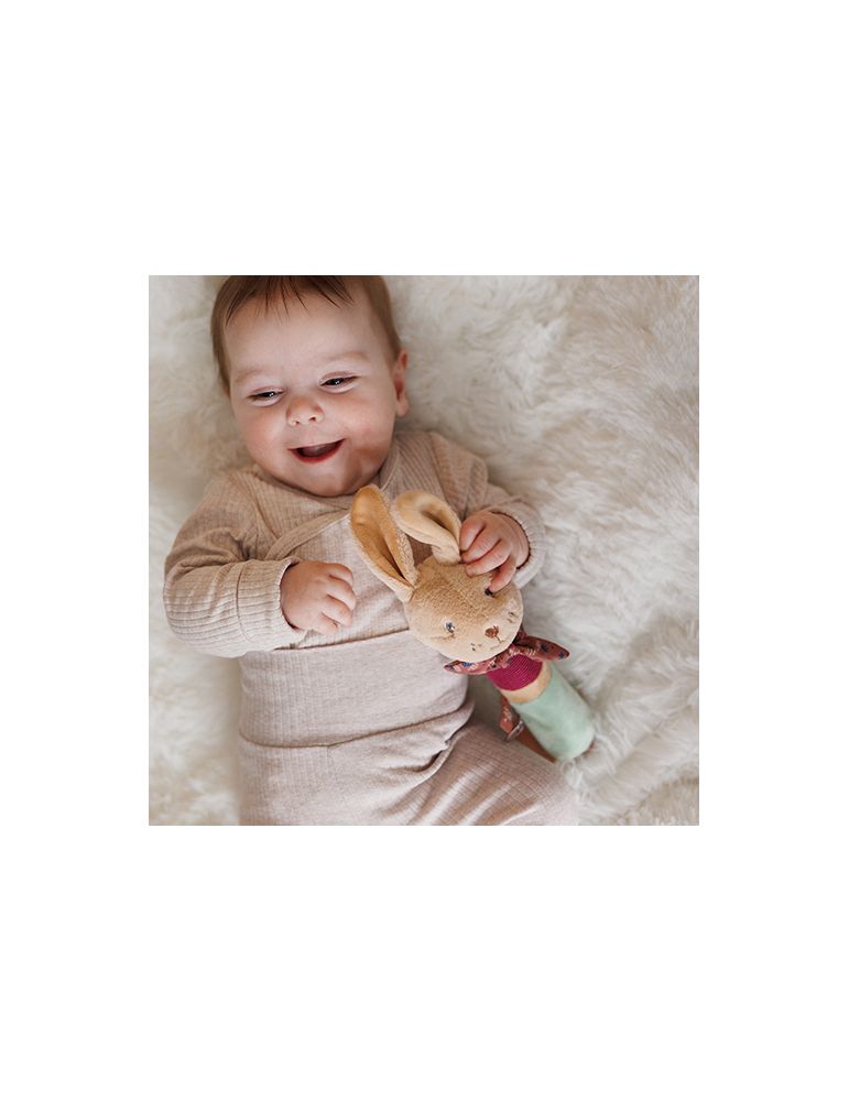 Różne kolory pobudzają wzrok, a długie uszy, supełek i tasiemki zachęcają do dotyku. Małe rączki chwytają i sprawdzają, doskonaląc zdolności motoryczne w domu i na spacerze.