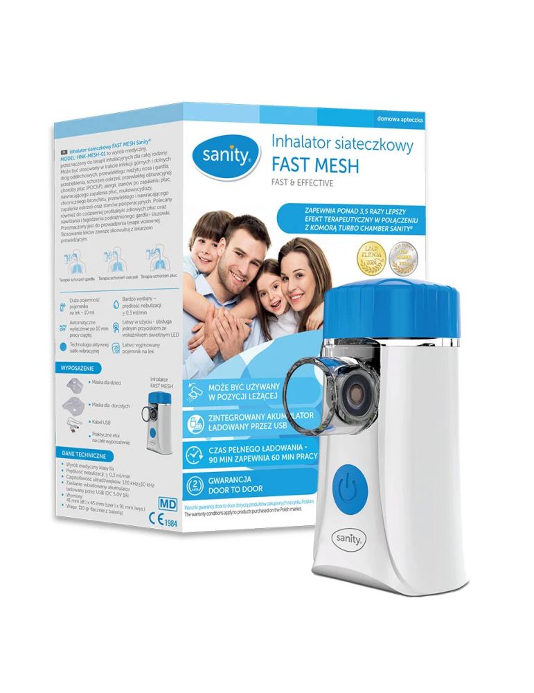 FAST MESH Sanity to innowacyjny inhalator siateczkowy, który zapewnia skuteczną terapię oddechową z maksymalną wygodą użytkowania. Dzięki możliwości stosowania w pozycji leżącej oraz wbudowanemu akumulatorowi ładowanemu przez USB, urządzenie idealnie sprawdzi się zarówno w domu, jak i w podróży.