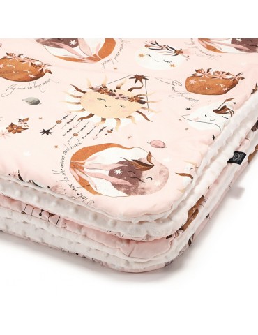 Dwustronna narzuta: wypełniona antyalergiczną, silikonową włókniną, nadającą niezwykłą lekkość jednocześnie zapewniając przyjemne ciepło. Jedna strona z miękkiej wysokogatunkowej bawełny, druga z idealnie dobranego kolorystycznie, miłego minky lub velvetu. Posłuży za okrycie podczas codziennych drzemek lub, z uwagi na swoją wielkość również jako narzutka na łóżeczko (ze względu na doskonałe jakościowo tkaniny można prać często bez obawy o zniszczenie). Kolor bawełny może różnić się ze względu na inną partię produkcyjną. Produkt należy stosować pod opieką rodzica.