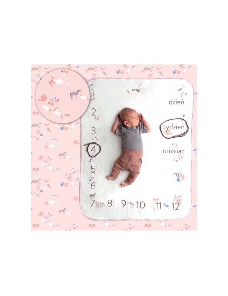 Snap the moment foto-kocyk to dwustronny kocyk, który rośnie razem z dzieckiem. Jedna strona służy do oznaczania wieku malucha, druga to tradycyjny kocyk dziecięcy. Pastelowe wzory zachwycą zarówno dziecko, jak i rodziców. Foto-kocyk doskonale sprawdzi się jako element wyprawki noworodka, a także kocyk przedszkolaka. W zestawie znajdują się 2 sznurki do oznaczania wieku maluszka oraz limitowana foto-karta.