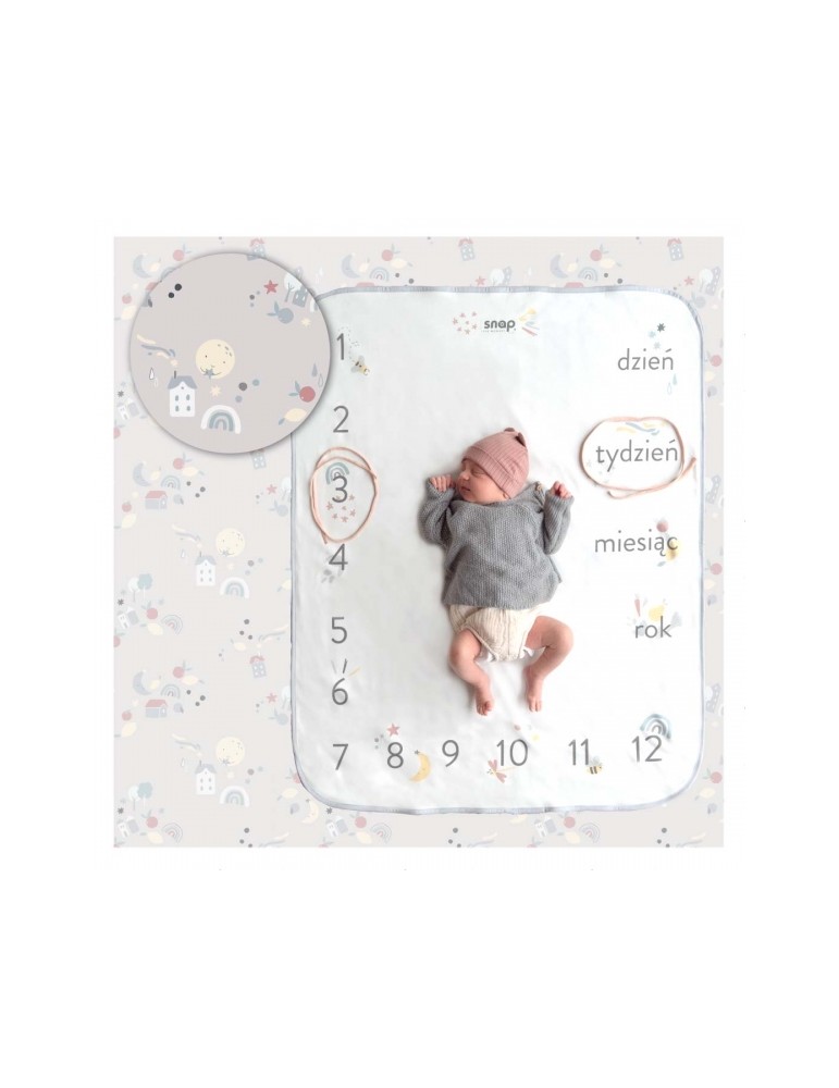 Snap the moment foto-kocyk to dwustronny kocyk, który rośnie razem z dzieckiem. Jedna strona służy do oznaczania wieku malucha, druga to tradycyjny kocyk dziecięcy. Pastelowe wzory zachwycą zarówno dziecko, jak i rodziców. Foto-kocyk doskonale sprawdzi się jako element wyprawki noworodka, a także kocyk przedszkolaka. W zestawie znajdują się 2 sznurki do oznaczania wieku maluszka oraz limitowana foto-karta.