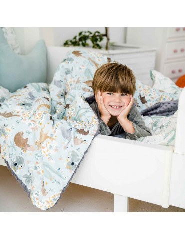 Dwustronny kocyk dla przedszkolaka, który sprawdzi się również w roli kołderki lub okrycia do leżakowania w przedszkolu. Jedna strona kocyka to najwyższej jakości bawełna w jednym z naszych wzorów, a druga strona to przemiłe minky lub elegancki Velvet. Kocyk w środku wypełniony jest antyalergiczną, silikonową włókniną, nadającą mu niezwykłą lekkość, jednocześnie zapewniając przyjemne ciepło. Do kocyka można dobrać poduszkę w tym samym wzorze i stworzyć wyjątkowy zestaw do spania lub do przedszkola!