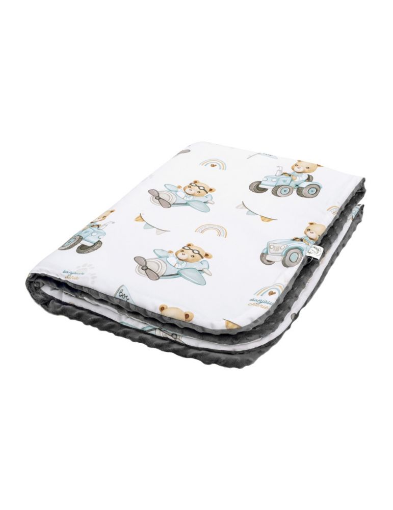 Kocyk wykonany jest z wysokogatunkowej bawełny 100%, którą z drugiej strony uzupełnia mięciutki plusz minky. Środek kocyka wypełniony jest antyalergiczną włókniną wysokopuszystą silikonową. Zapewnia ona dziecku ciepło oraz wygodę podczas użytkowania.