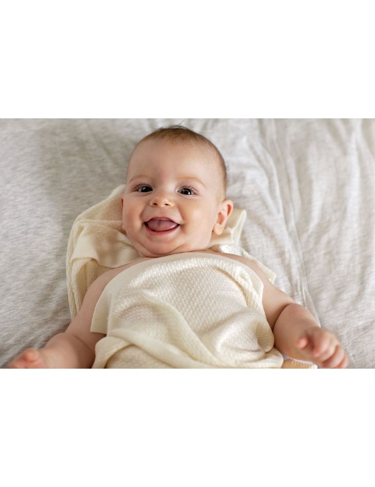 Kocyk jest wykonany z delikatnej przędzy bambusowej, która posiada właściwości termoregulujące, możesz otulać nim swoje dziecko bez obawy o przegrzanie.