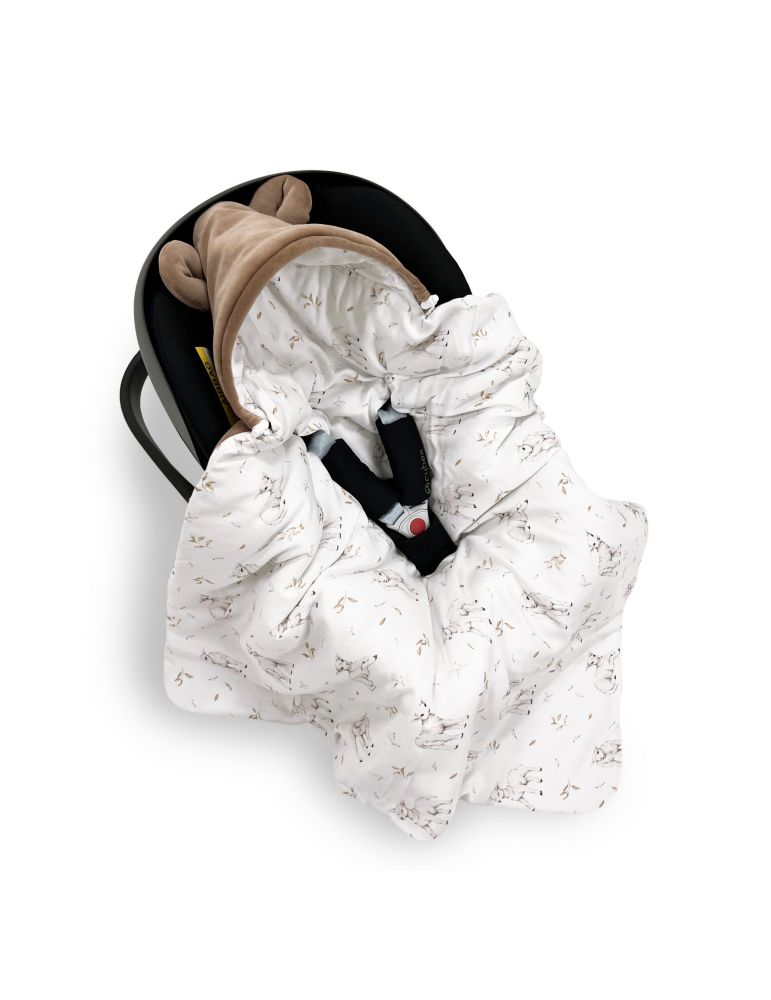 Kocyk został wykonany z najwyższej jakości, certyfikowanej, delikatnej przędzy bambusowej oraz miękkiego, bawełnianego weluru. Dzięki antyalergicznemu wypełnieniu silikonowemu jest lekki, ale cieplutki. Jest bardzo wygodnym rozwiązaniem przy podróżach czy spacerach z dzieckiem. Nie ma potrzeby już wyjmować, budzić za każdym razem maleństwa, kiedy chcesz z nim przejść, np.: z auta do pomieszczenia. Jego większy rozmiar sprawia, że posłuży nam naprawdę długo. Zapewnia komfort maluszkowi, chroniąc je przed chłodem i przyjemnie otulając w trakcie podróży czy spaceru. Dzięki uniwersalnym przeszyciom na pasy pasuje nie tylko do każdego 3-punktowego fotelika (0-13), ale również spacerówki. Kapturek jest w specjalny sposób ukształtowany, aby nie opadał dziecku na oczka. Posiada również ściągacz, aby w chłodniejsze dni móc szczelniej osłonić główkę przed wiatrem.