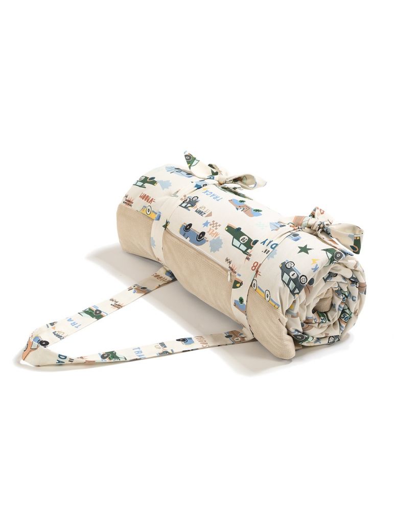 Praktyczny koc, który sprawdzi się w roli maty piknikowej, koca na trawę i plażę oraz jako mata do zabawy dla najmłodszych. Wiemy, że na takim kocu miejsca nigdy za wiele dlatego postaraliśmy się o to, aby nie zabrakło go nawet dla dużej rodziny! Mata wyposażona jest w kieszonkę zapinaną na zamek, do której można schować klucze, pieniądze lub telefon. Posiada wygodny uchwyt i wstążki, dzięki którym można ją łatwo zwinąć i nosić na ramieniu. Spód koca wykonany jest z wodoodpornego ortalionu, dzięki któremu maty można używać również na wilgotnym podłożu.
