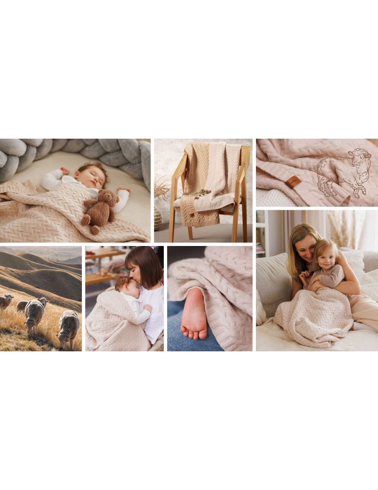 Nasz kocyk dla dzieci wykonaliśmy z wełny pozyskiwanej z runa owiec merynosów. Cienkie i sprężyste włókna nie gryzą i nie podrażniają, są hipoalergiczne i antybakteryjne. Przyjemnie otulą wrażliwą skórę dziecka.