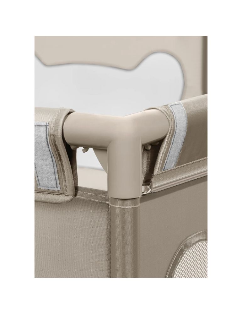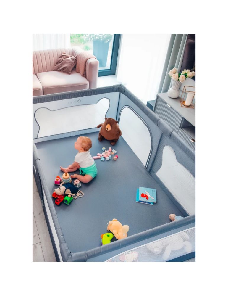 Produkt został wyposażony w boki wykonane z przewiewnej siateczki, która nie tylko gwarantuje cyrkulację powietrza, ale również zapewnia dobrą widoczność zarówno dziecku, jak i rodzicowi. Natomiast kształt przypominający głowę misia sprawia, że maluch chętnie spędza czas w środku. Wszystkie elementy konstrukcyjne kojca znajdują się na zewnątrz, dzięki czemu przestrzeń jest w pełni bezpieczna. Dwa boczne wejścia otwierane na zamek sprawiają, że większe dzieci mogą samodzielnie wchodzić i wychodzić z kojca.