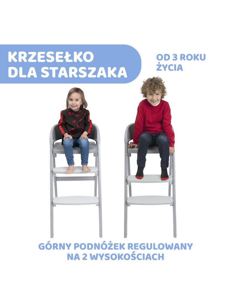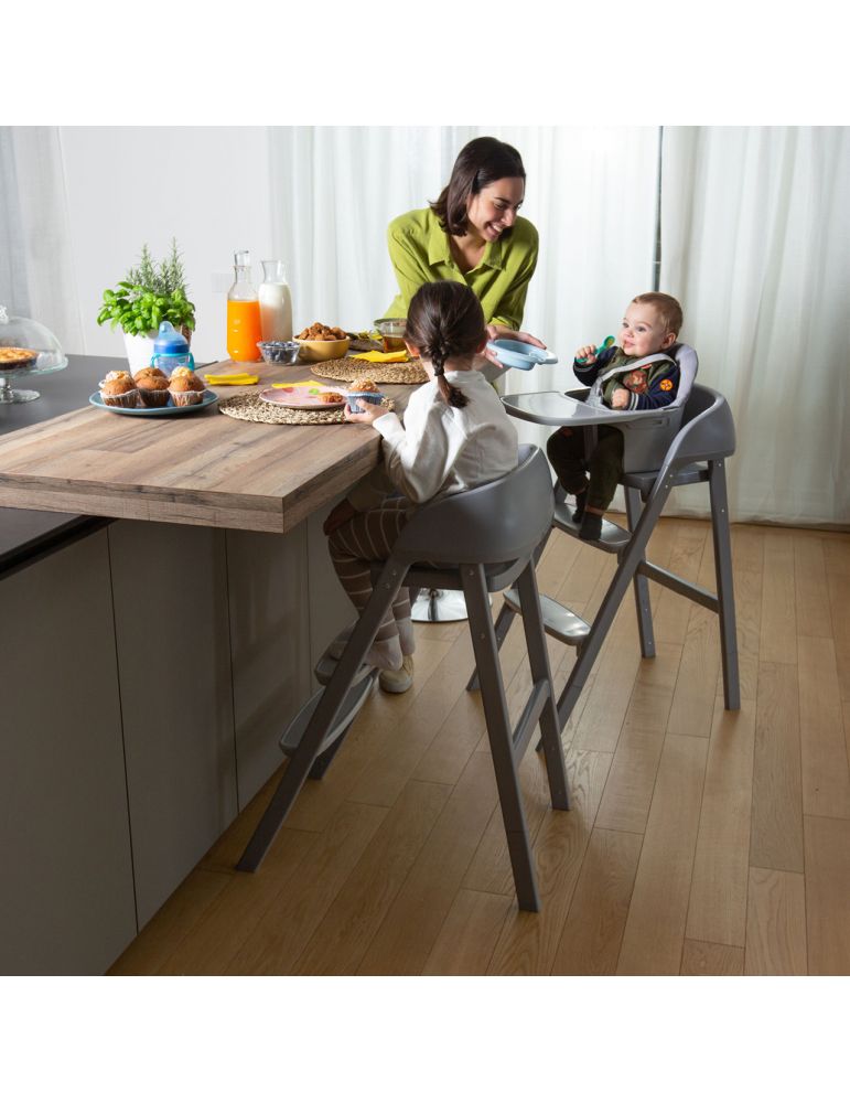 Dzięki 3 konfiguracjom dzieci mogą zasiadać do stołu z całą rodziną. Dodatkowe nóżki, które są w zestawie, zmieniają wysokość krzesełka i można zasiadać do posiłku z rodziną także przy wyspie kuchennej. Górny podnóżek można ustawić na 2 różnych wysokościach i dopasować krzesełko do wzrostu dziecka. Siedzisko wykonane zostało z tkaniny z recyklingu i wyposażone w praktyczną tackę, idealną kiedy dziecko chce jeść samodzielnie lub się bawić. Krzesełko po złożeniu jest kompaktowe i zajmuje bardzo mało miejsca.
