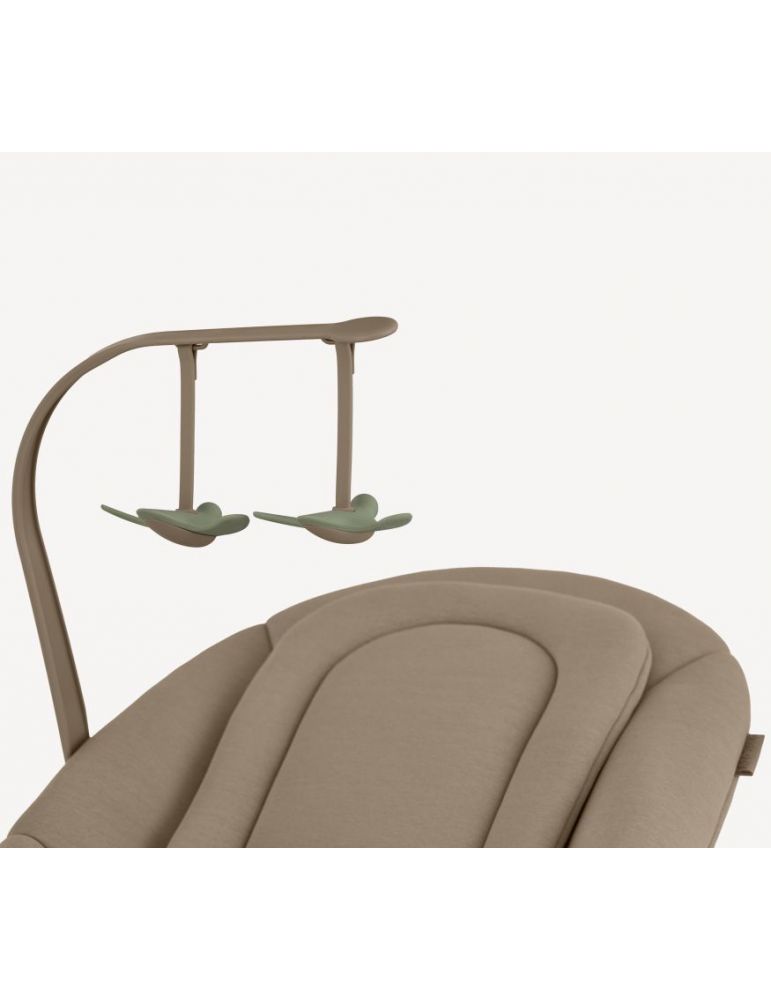 Siedzisko dla noworodka wyposażone jest w zabawki o kontrastowych kształtach i kolorach, które delikatnie stymulują wzrok oraz rozwój sensoryczny dziecka od pierwszych tygodni życia.