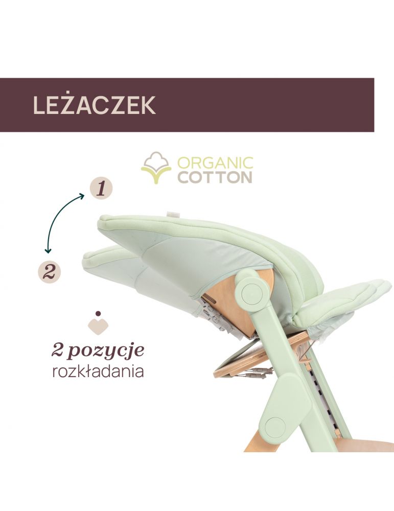 Komfortowy i otulający leżaczek wykonany z miękkiej, otulającej tapicerki; odszyty z bawełny organicznej przyjaznej dla bardzo wrażliwej
