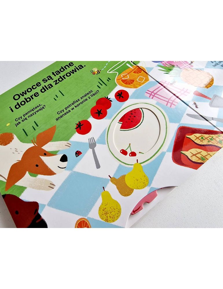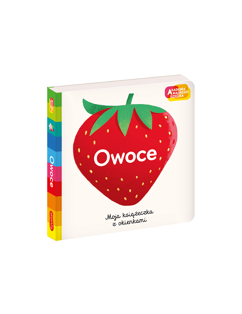 Książeczka pt. Owoce pokazuje różnego rodzaju owoce dzieląc je na różne kategorie. Na pierwszej rozkładówce poznajemy sezonowe owoce oraz cały ich cykl dojrzewania. I tak dowiadujemy się, że brzoskwinia rośnie na drzewie, które wcześniej miało kwiaty zapylone przez pszczoły. Inne owoce o których może poczytać to morele, maliny i truskawki. Kolejna rozkładówka pokazuje owoce, które mają pestki: jabłka, gruszki czy śliwki. Następnie czytamy o warzywach, które są owocami! To na przykład arbuz, cukinia czy pomidor. Oprócz ciekawej wiedzy, nasz czytelnik ma mnóstwo okienek do otworzenia, dzięki czemu może ćwiczyć swoje paluszki.