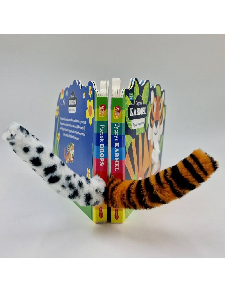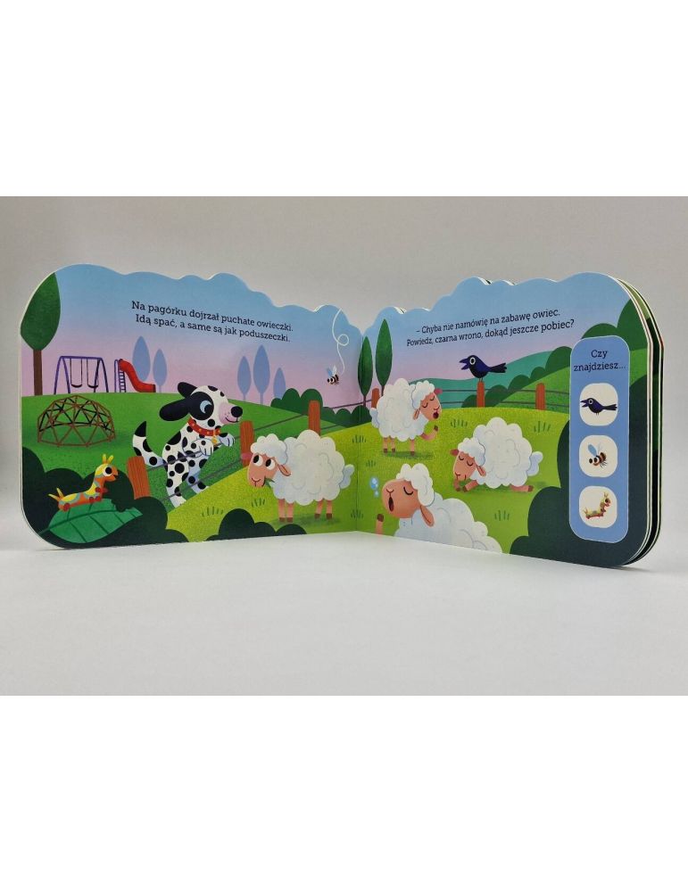 Książeczka oprócz barwnych ilustracji i rymowanego wierszyka, zaprasza do zabawy w szukaj i znajdź. Na każdej stronie nasz czytelnik musi odnaleźć trzy różne rzeczy, dzięki czemu czytanie jest jeszcze przyjemniejsze. Dodatkowo książeczka może być też super zabawką, z jej grzbietu wystaje puszysty ogon psa! Nie sposób na półce z książkami nie zauważyć puchatego biało – czarnego ogonka!