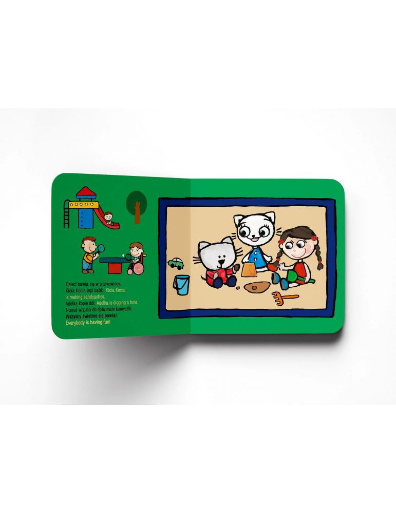 W Akademii Kici Koci najmłodsi czytelnicy odkrywają świat i przydatne słowa z najbliższego otoczenia. „Plac zabaw. Playground” to trzecia książeczka z serii, w której Kicia Kocia i Nunuś uczą maluchy i pierwsza, dzięki której dziecko w sprytny sposób zetknie się z językiem angielskim. Co bardzo ważne, Kicia Kocia nie operuje pojedynczymi wyrazami, a pełnymi komunikatami. Dzięki temu – podobnie jak z przyswajaniem języka ojczystego – nauka jest naturalna i intuicyjna. Are you ready? Let’s play!
