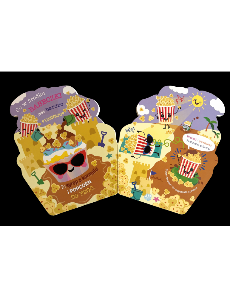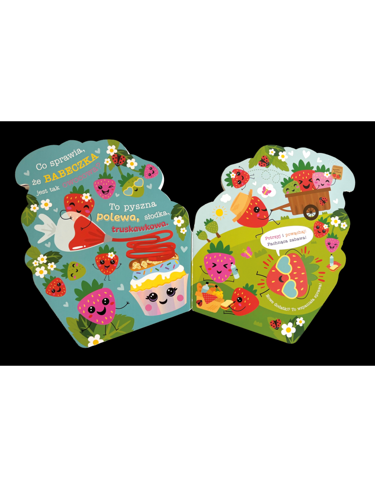 Maluch słucha wierszyków o słodkich dodatkach do babeczki, którymi jest wypełniona. W trakcie lektury poznaje zapachy słodkiej posypki, sosu karmelowego czy polewy truskawkowej. Atutem jest możliwość potarcia obrazków, aby poczuć różne aromaty.