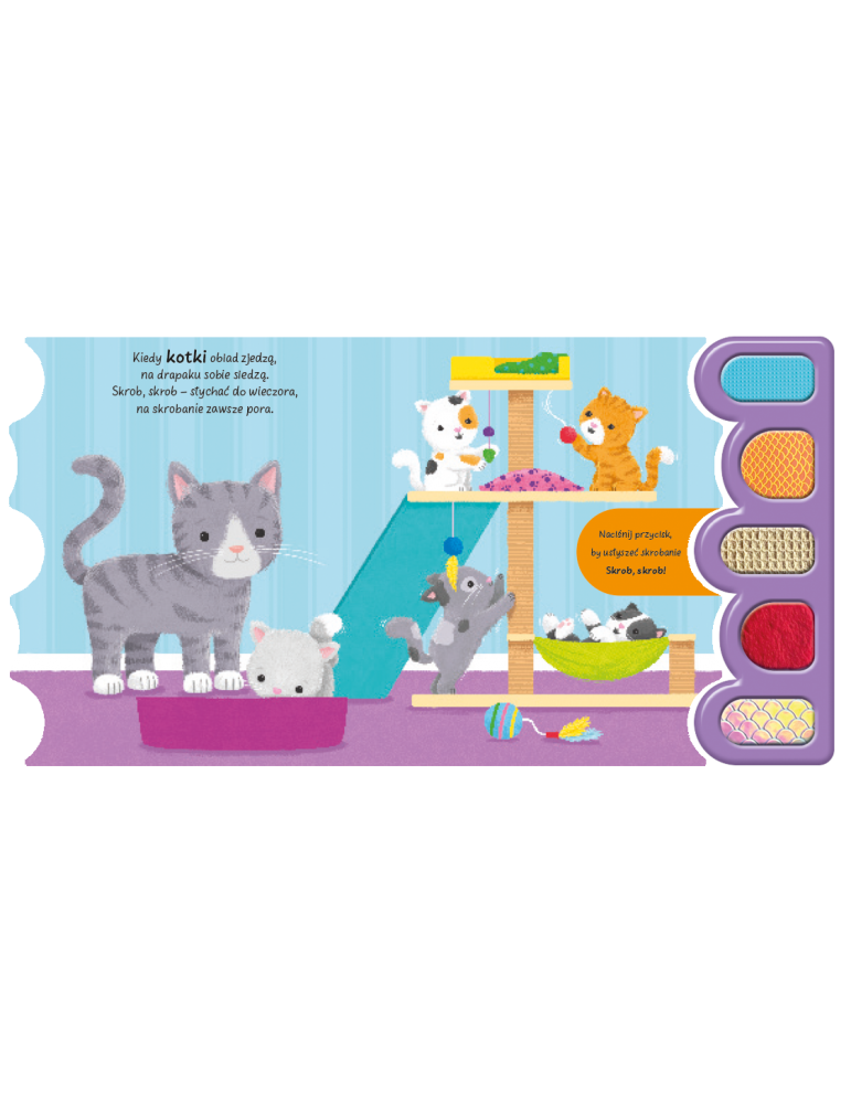 Poznaj wesołe domowe zwierzaki. Ta dotykowa książka dla maluszka zawiera zabawne wierszyki oraz aż 5 dźwiękowych przycisków sensorycznych. Czytaj, słuchaj i dotykaj!