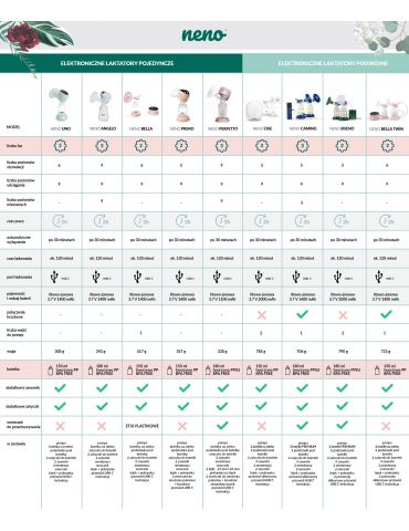W zestawie Neno Camino oprócz urządzenia pompującego znajdziesz również dwie butelki na mleko oraz pasujące do nich smoczki, jak i również lejki, nakładki i podstawki ułatwiające użytkowanie laktatora.