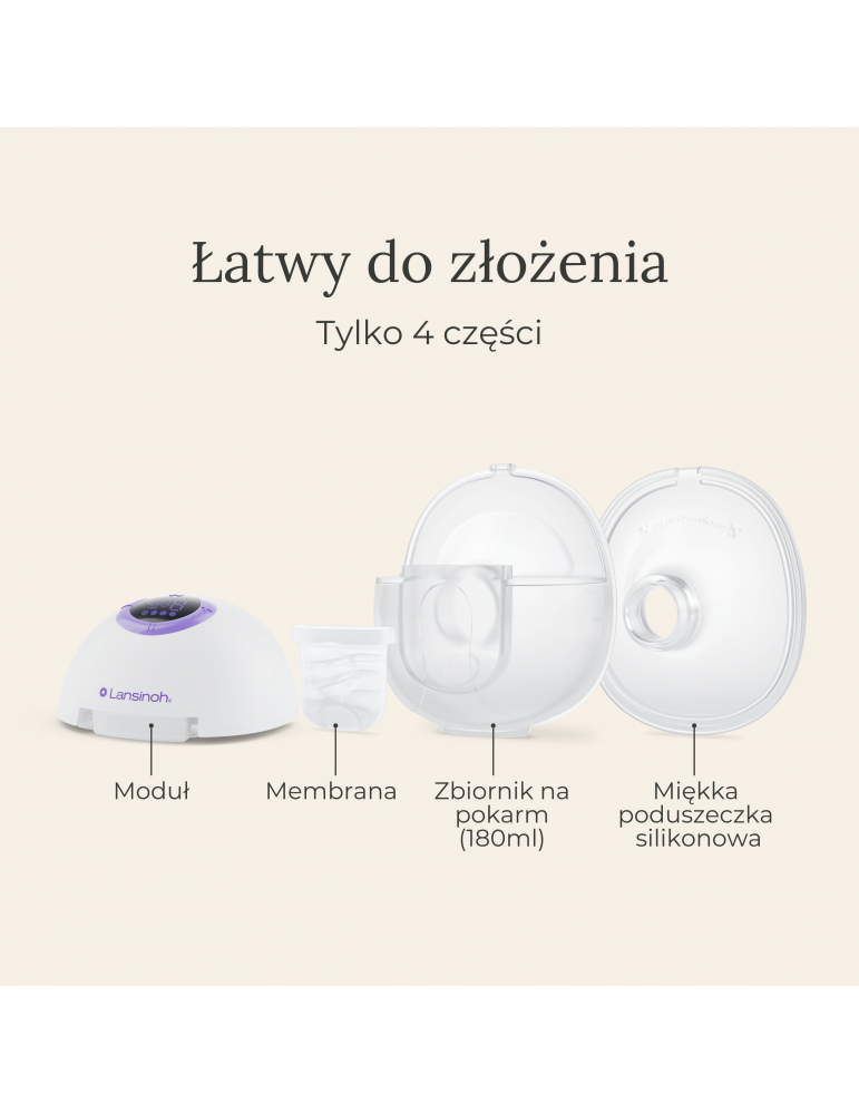 Wyjątkowo cicha i lekka konstrukcja, z baterią wystarczającą na 1,5 godziny, umożliwiająca odciąganie pokarmu bez użycia rąk a do tego tylko 4 części, które można myć w zmywarce.