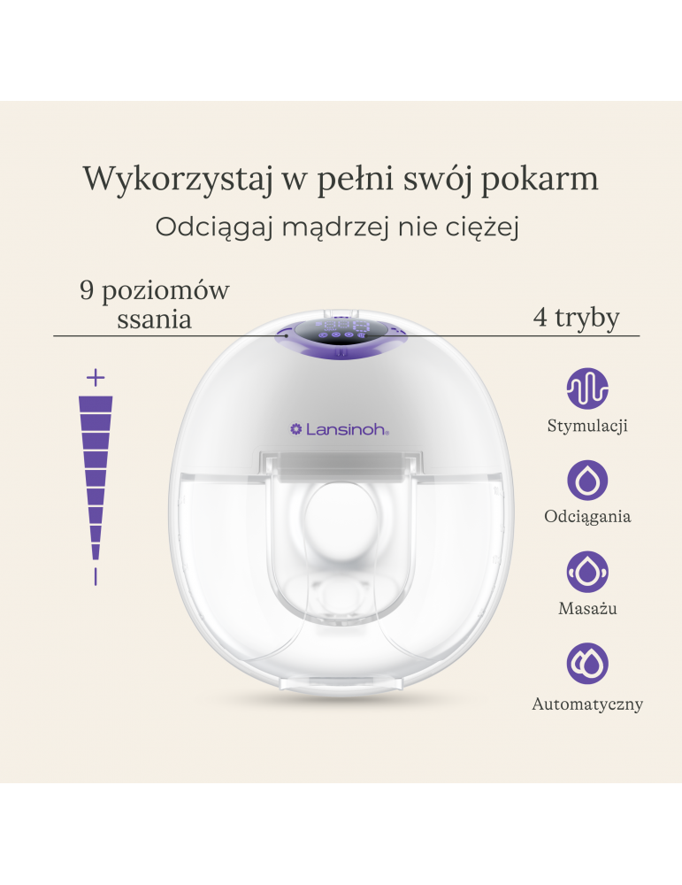 Całkowicie niewymagający użycia rąk, poręczny laktator Lansinoh dyskretnie mieści się w biustonoszu, bez rurek i kabli, umożliwiając przenośne odciąganie w dowolnym miejscu, bez kompromisów w zakresie mocy i jakości która mieści się na poziomie laktatorów szpitalnych.