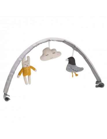 Dodatkowo teraz dołączono fantazyjny pałąk z trzema wiszącymi dzianinowymi  zabawkami - ptaszek, chmurka i króliczek . Pałąk angażuje i bawi dziecko odważnymi kolorami i kształtami.