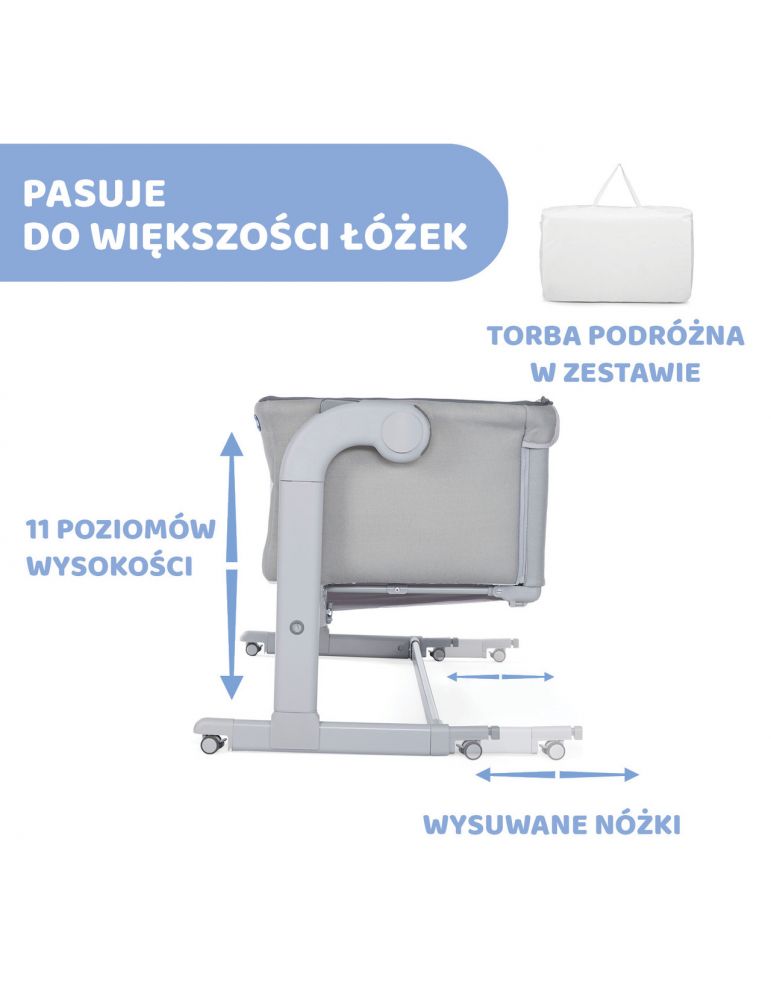 Łóżeczko – dostawkę dla niemowlaka Chicco Next2Me można ustawiać aż na 11 wysokościach, dzięki czemu dopasujemy je do każdego łóżka. Co więcej, wysuwane nóżki tego łóżeczka pozwalają na dostawienie go zarówno do łóżka z szufladami, jak i bez szuflad.