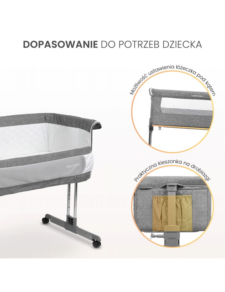 Sleep2gether to łóżeczko 2w1, które zostało stworzone z myślą o bliskości. Może pełnić funkcję samodzielnego łóżeczka, jednak swoje prawdziwe możliwości pokazuje po demontażu przedniej ścianki. Sleep2gether można dostawić do łóżka rodziców, dzięki czemu karmienie i opieka mogą odbywać się bez wstawania z łóżka. Dzięki 7 stopniowej regulacji wysokości, wbudowanym kółkom z blokadą oraz nogom z regulacją położenia, bez problemu można je dopasować do niemal każdego łóżka. W zestawie znajduje się wygodny materacyk z usztywnionym podłożem oraz pasy pozwalające na przypięcie Sleep2gether do łóżka rodziców. Na wyjątkowy wygląd składa się połączenie ponadczasowej szarości z elegancką i delikatną, pikowaną tkaniną wewnątrz łóżeczka