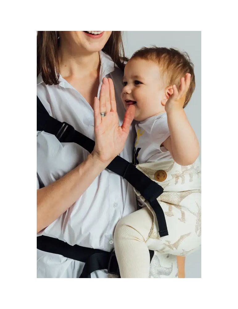 Stabilny i wygodny, regulowany pas biodrowy oraz elastyczne ramię pozwalają łatwo i szybko dopasować nosidełko do rodziców o różnej budowie ciała